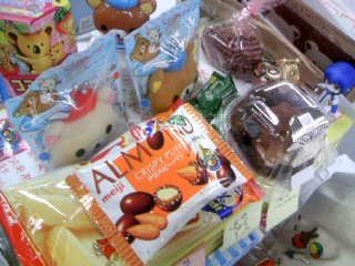 コンビニ生ケーキとか、お菓子とかリラクマストラップとか、